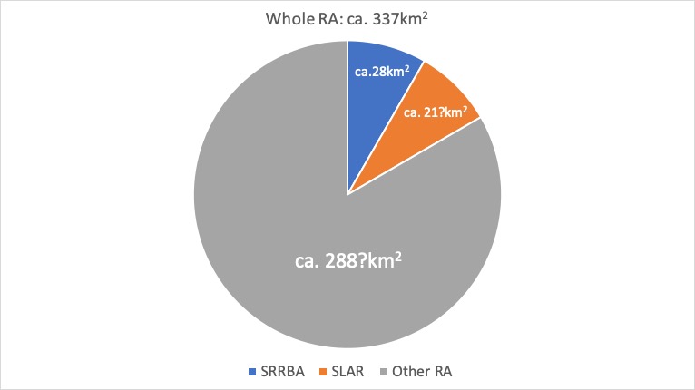 Whole area of the Restricted Areas is around 337 km2, but the area of the SRRBA occupies around 8%: around 28km2 (on a population basis, it is approximately 70% coverage).