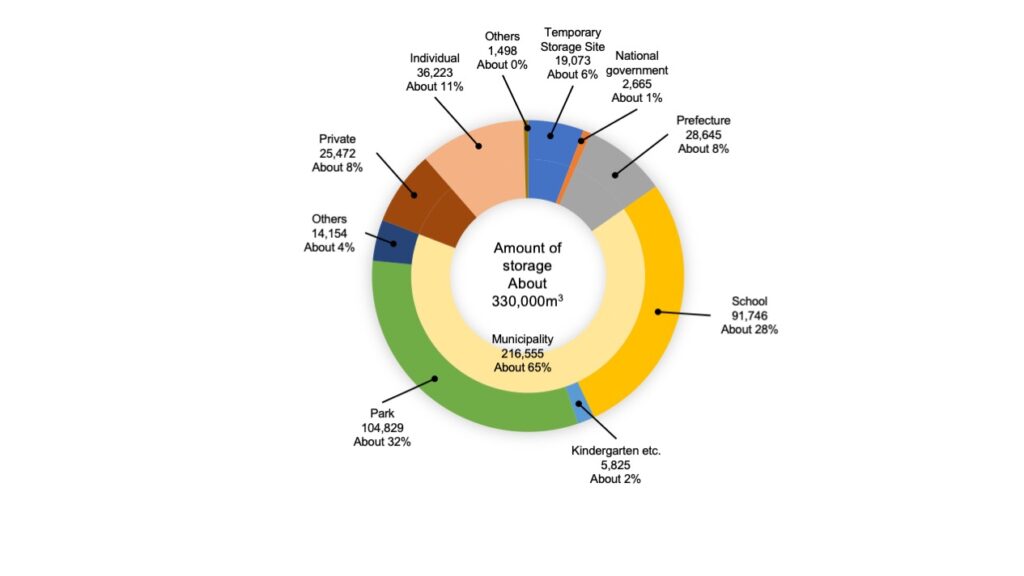 Total amount of storage is about 330,000m3, and among that Tochigi Prefecture occupies about one-third, followed by Chiba Prefecture of about 30%.