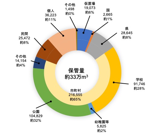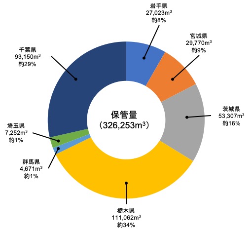 保管量については、総量が約330,000m3で、最も多い栃木県が約3分の1を占め、その次に多い千葉県が約30%を占めています。